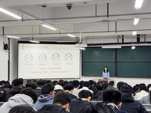 班会焦树立正确世界观、人生观、价值观核心目标,以丰富多样的形式深化廉洁教育实效。班会上,团支部书记韩云结合校园奖助学金评定、社团干部选举等常见场景,生动讲解廉洁自律的重要意义,不仅系统学习了校纪校规和大学生行为准则。还结合体育专业特点,深入剖析了赛事公平、诚信应试、团队协作等方面可能存在的廉洁风险点。通过生动的正反典型案例分析,着重强调“廉洁是立身之本,纪律是前行之基”,系统阐释了“廉洁”的内涵——既是“品行清白、清廉自守”的品质,在校园视角下也等同于“诚信+节俭+规则意识”的结合,并列举了形式主义、官僚主义等校园“四风”风险点,提醒新生警惕日常中的廉洁隐患,叮嘱新生要从入学之初就守住小节、远离红线。